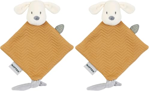 Nattou Mini Doudou Plat, Chien Charlie, Compagnon de Route dès la Naissance, Env. 28 cm, Végétalien, Jacquard, Coton/Polyester, Caramel (Lot de 2)