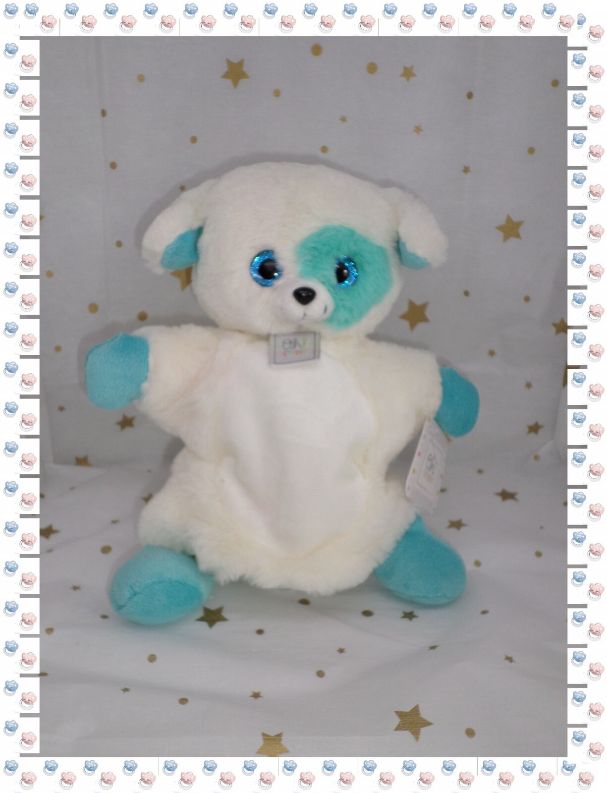 ⑲ Doudou Marionnette Chien Ours Blanc Bleu/Vert Oh Studio ! Doudou et Compagnie