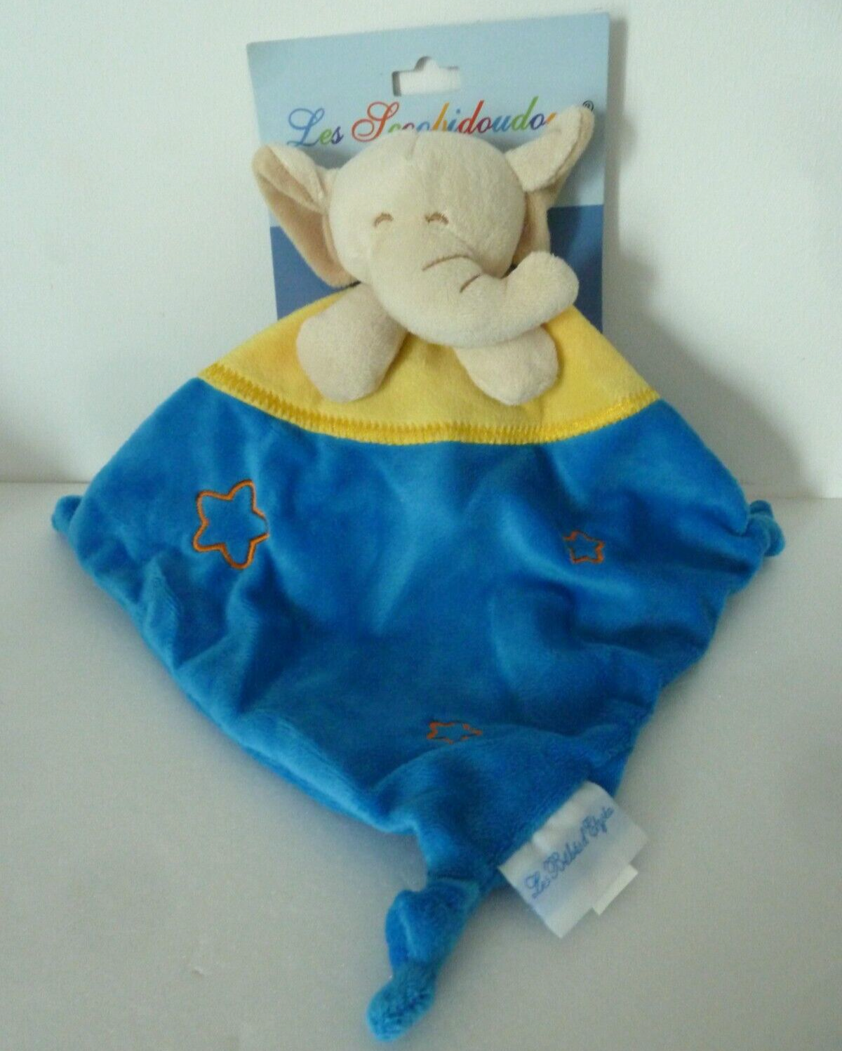 21. DOUDOU PLAT Les bébés d'Elyséa TALI ELEPHANT bleu jaune étoile 100% NEUF