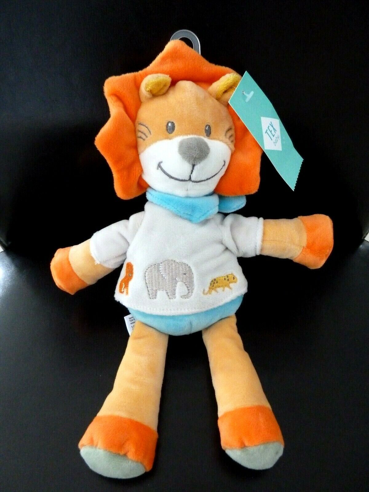Y7 - DOUDOU PELUCHE TEX BABY LION ORANGE JAUNE FOULARD BLEU ELEPHANT 31cm NEUF