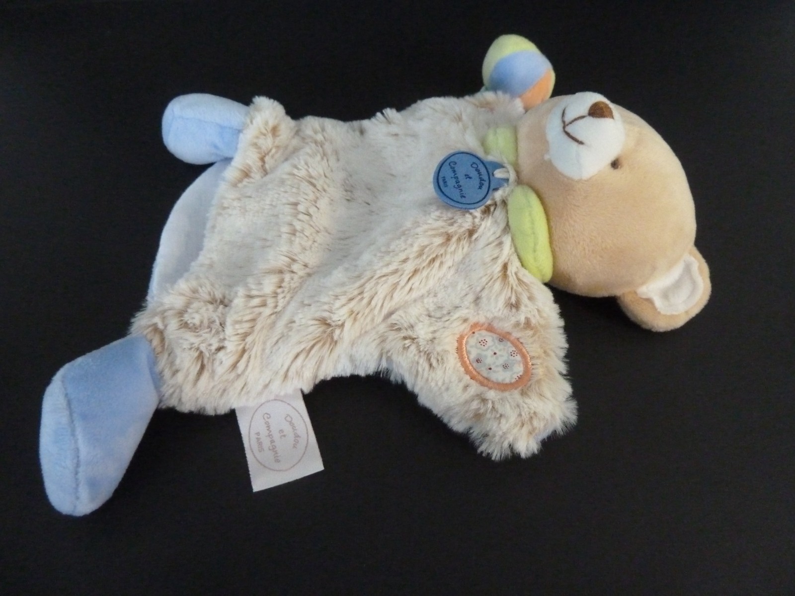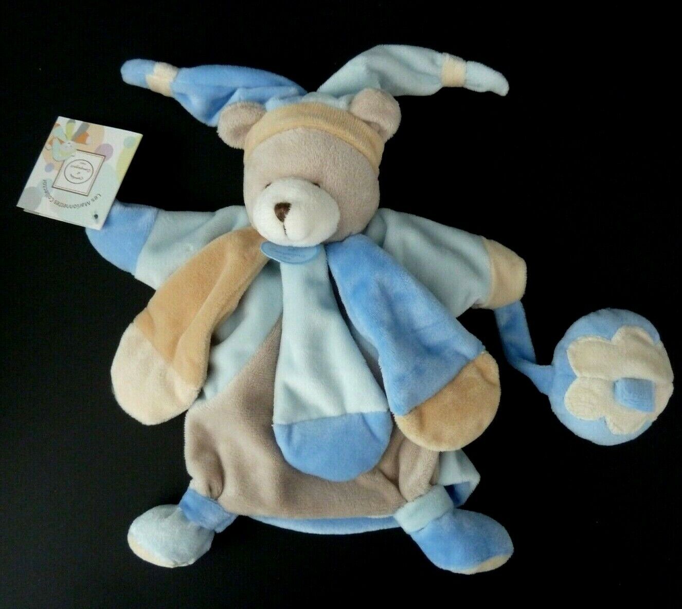 89. DOUDOU ET COMPAGNIE PELUCHE OURS MOUCHOIR BLEU BLANC BEIGE DC3036 NEUF boite
