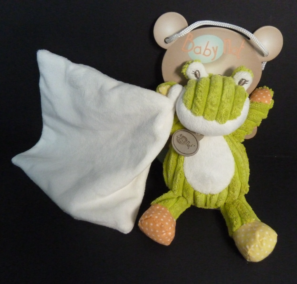SE*. GRENOUILLE BABY NAT avec doudou mouchoir vert blanc côtelés 18cm BN735 NEUF