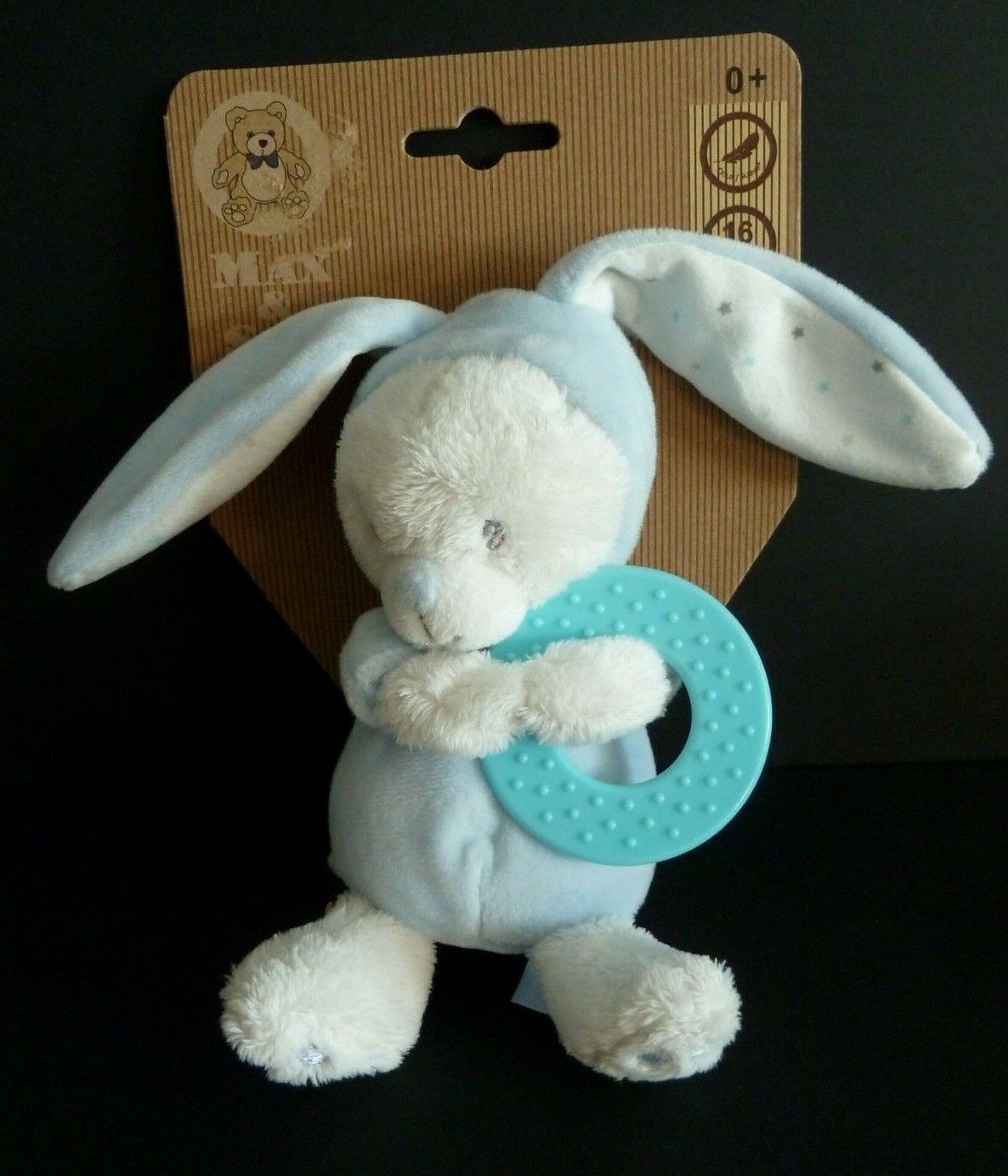 C2. DOUDOU ANNEAU MAX ET SAX OURS CAPUCHE LAPIN BLEU BLANC ETOILE 17cm 100% NEUF