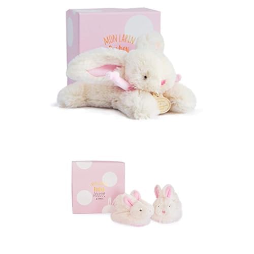 Doudou et Compagnie Lot Lapin Bonbon Rose : Doudou 16cm + Chaussons Hochet 0-6 Mois - Boîtes Cadeaux - pour Bébé Fille/Garçon - Garantie Doudou Perdu - DC3375 + DC1308