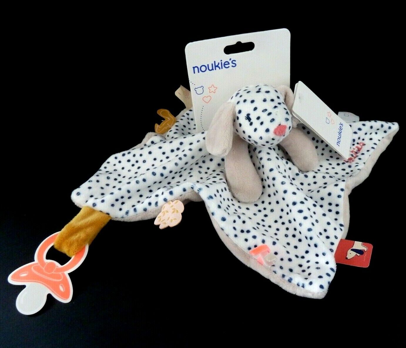 E2. DOUDOU PLAT NOUKIE'S CHIEN TIDOU AMY & ZOE BLANC POIS BLEU ROSE JAUNE NEUF