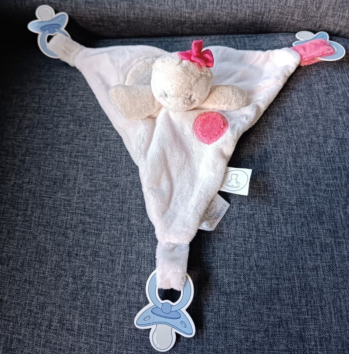 θ - Doudou Plat Triangle Pingouin Blanc Rose Attaches Tétines Noukies Noukie's
