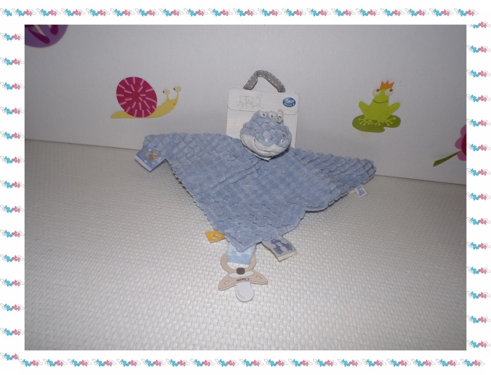 ☻ - Doudou Plat Crocodile Bill Tidou Bleu Blanc Etiquettes Noukie's Noukies