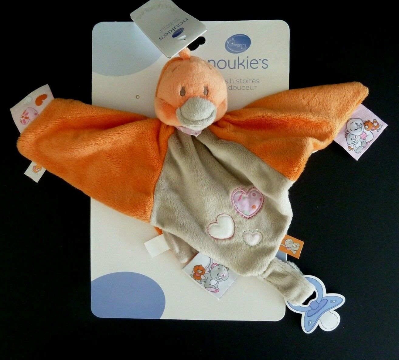 *. DOUDOU PLAT NOUKIE'S OISEAU POUSSIN ORANGE GRIS BEIGE COEUR ROSE 100 % NEUF
