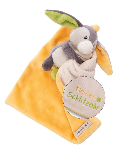 NICI 49751 Doudou pour bébé, 22 x 22 cm, avec Doudou âne, Doudou Moelleux, pour Fille et garçon, Cadeau de Naissance, avec Inscription brodée « Petite Oreille Fendue »