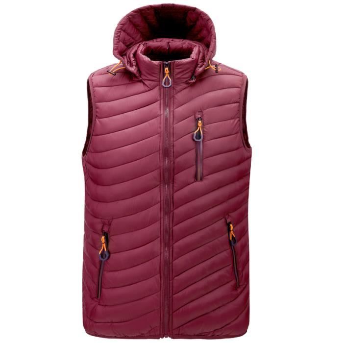 Doudoune HommeSans Manche Doudoune avec Capuche Amovible avec ZippéVeste en Duvet à Capuchon Chaud en Automne et En Hiver-Rouge