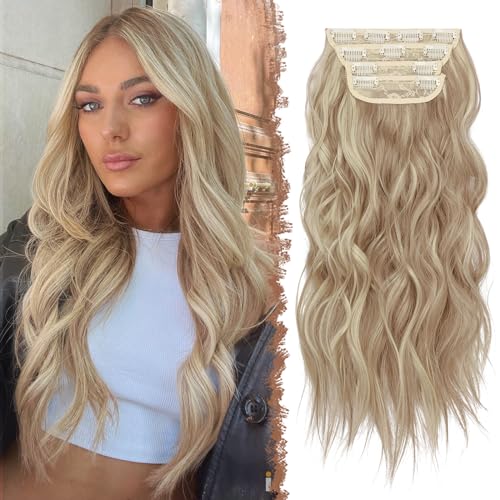 FESHFEN Extension Clip Cheveux Ondulés - 4 PCS Longue Ondulées Bouclées Extension à Clip Cheveux Synthétique Naturel Postiche Extensions pour Femme 50 cm Doré Foncé mélangé à Blond Beige