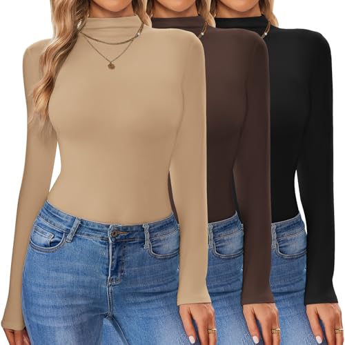 Ekouaer Tshirt Thermique Femme Manche Longue sous Vetement Thermique Femme Haut Thermique col Roulé 3pcs, Noir/Beige/Marron, S