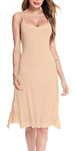 Vlazom Fond de Robe Femme Modal Longue Jupon sous Robe avec Bretelles Lingerie Chemise de Nuit sans Manches,Beige,XL