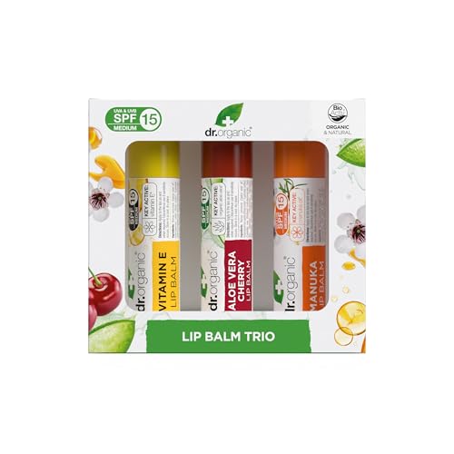 Dr Organic Lot de 3 baumes à lèvres Assorted Protection SPF 15 Vitamine E, Aloe Vera Cherry & Manuka Vegetarian, Cruelty, Paraben & SLS Free 5,7 ml