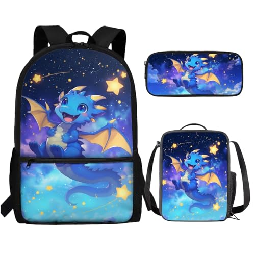UOIMAG Ensemble de 3 sacs à dos et boîte à déjeuner mignons pour filles et garçons avec trousse à crayons, Dragon Stars, Taille unique, Ensemble cartable