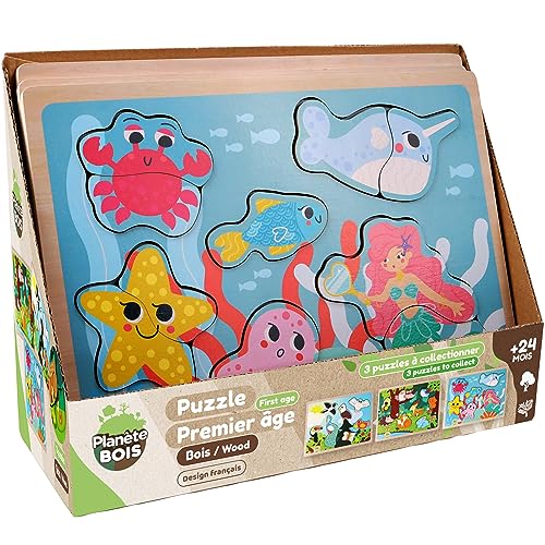 PLANÈTE Bois - Pack de 12 Puzzles Terre Mer Ciel - FSC - Jeu Educatif - Première Réflexions - 052463APA - 8 Pièces - Multicolore - Bois - Jeu pour Enfant - 30 cm x 22,5 cm - À Partir de 2 Ans