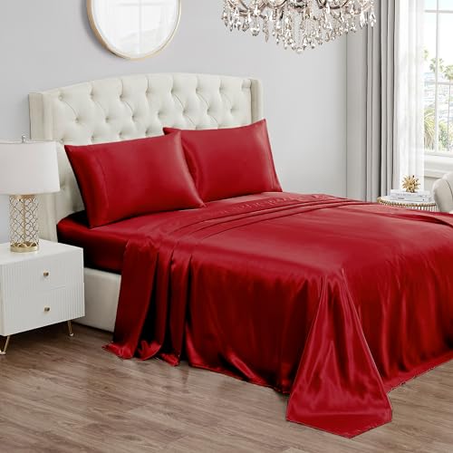 Luxbedding Parure de lit 4 pièces en Satin de Soie Douce avec 1 Drap-Housse à Poche Profonde, 1 Drap Plat, 2 taies d'oreiller - Rouge