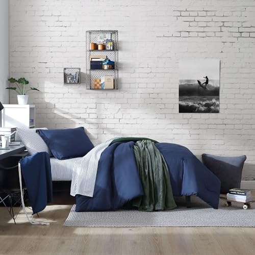 Nautica Parure de lit réversible décontractée avec Couvre-Oreiller(s) en Bonus, Drap-Housse, taie(s) d'oreiller et Sac à Linge, Polyester, Bleu Marine uni, lit Simple/jumeau XL