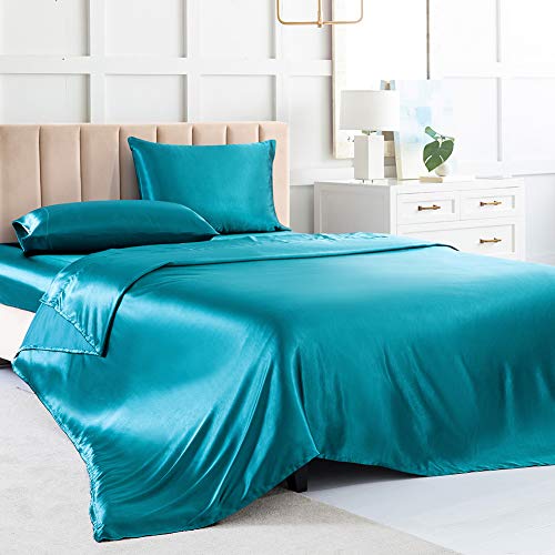 Luxbedding Parure de lit Douce 4 pièces en Satin de Soie avec 1 Drap-Housse à Poche Profonde, 1 Drap Plat, 2 taies d'oreiller (Bleu Sarcelle)