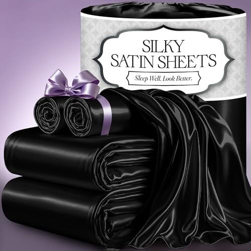 DECOLURE Parure de lit 4 pièces, 8 Couleurs, en Satin de Soie – avec 2 taies d'oreiller, Drap-Housse en Satin – pour lit Double – Noir