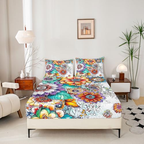 Homewish Drap Housse 90x190 Enfant Bohémien Floral,Drap-Housse Boho du Milieu du Siècle,Drap de Lit Fleur de Ferme Colorée Enfants Adultes Esthétique Élégante Botanique avec 1 Taie d'oreiller 51x75cm