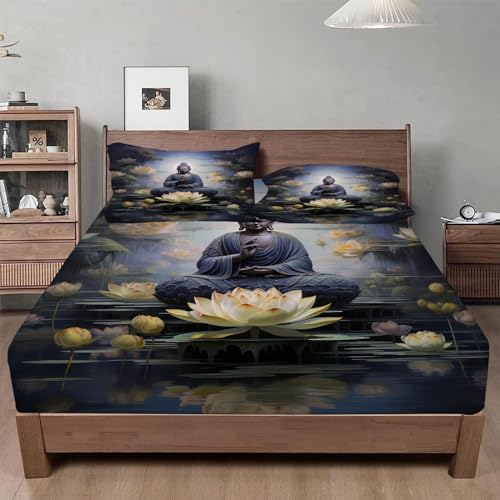 Drap Housse 140x190 Bouddha Drap-Housse Lotus Drap Plat pour Lit avec Grand Bonnet de 30 cm Draps Housse Microfibre et 2 Taies d'oreillers, pour Matelas éPais