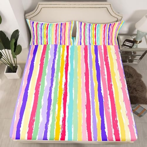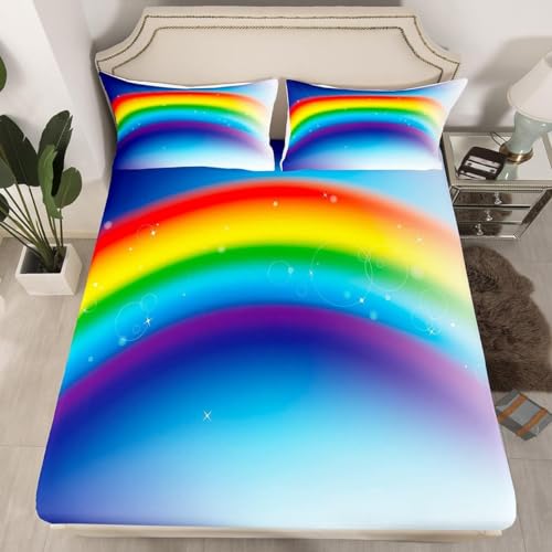 Drap Housse 140x190 Arc-en-Ciel, 3D Images de Dessins Animés Drap-Housse 140 x 190, Drap Plat 2 Personnes, Drap Housse Enfant Adulte avec 2 Taies d'oreillers pour Matelas Épais b3076