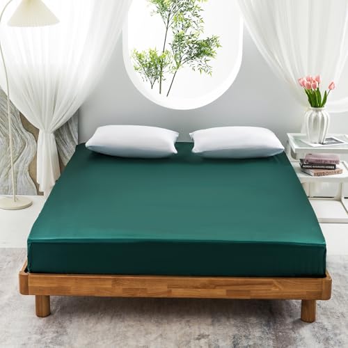 Morbuy Drap Housse 140x190, Vert Foncé Satin Draps Housses pour Matelas Épais Jusqu'à 30 cm, Luxe Drap-Housse en Microfibre Soyeux, Lisse Respirant et Doux