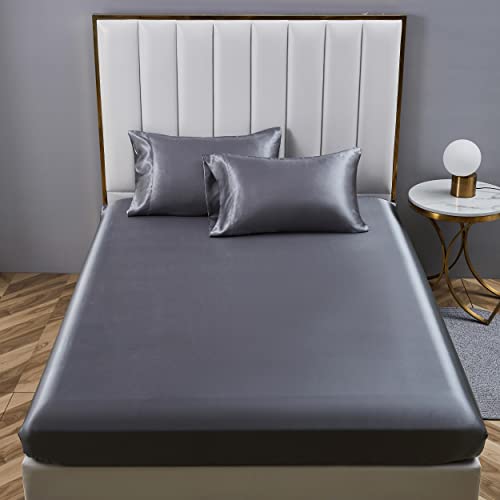 YASMENG Drap Housse 140x190 Satin Gris Foncé Uni Bonnet 30 cm Soyeux Brillant Luxe Soie Drap de lit en Satin de Soie Polyester Douce Lisse Respirant pour Matelas Épais
