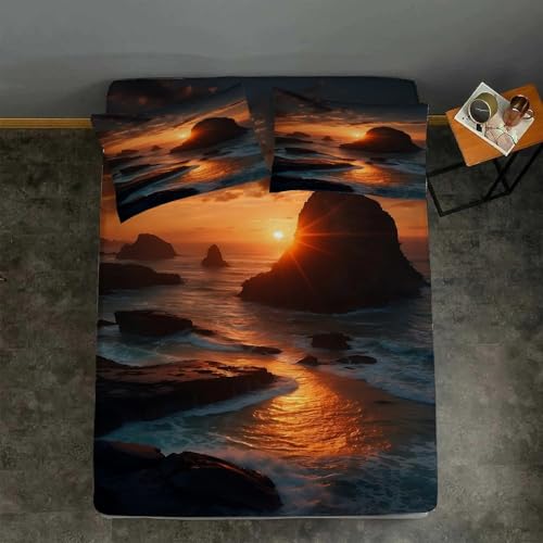 Drap Housse 140x190 cm Vue sur la Mer, 3D Coucher de Soleil Drap-Housse en Microfibre, Drap Plat 2 Personnes, Drap Housse avec 2 Taie d'oreillers pour Matelas Épais Q/L1719