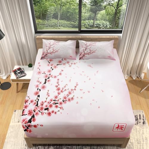 TACOKI Drap Housse 140x190 Style Japonais, 3D Fleurs de Cerisier Drap-Housse 140 x 190, Drap Plat 2 Personnes, Drap Housse Enfant Adulte avec 2 Taies d'oreillers pour Matelas Épais a5904