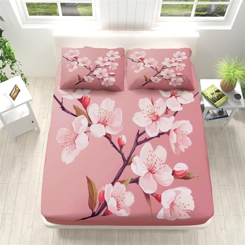 Drap Housse 140x190 Sakura Rose, 3D Style Japonais Drap-Housse 140 x 190, Drap Plat 2 Personnes, Drap Housse Enfant Adulte avec 2 Taies d'oreillers pour Matelas Épais b2313
