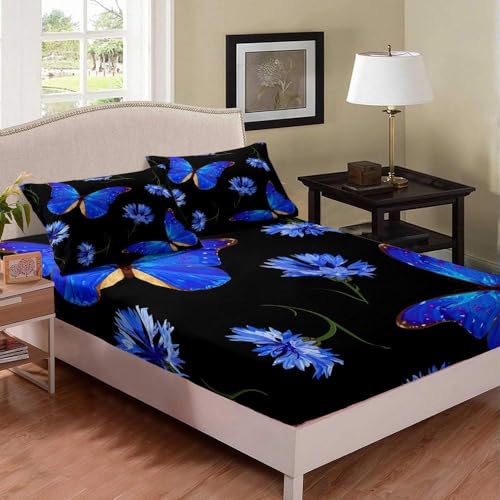 Drap Housse 140x190 cm Papillon Bleu, 3D Fleurs Drap-Housse en Microfibre, Drap Plat 2 Personnes, Drap Housse avec 2 Taie d'oreillers pour Matelas Épais BL1725