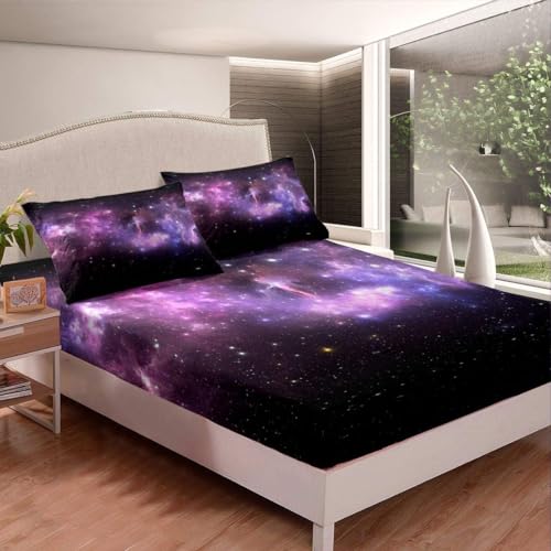 Drap Housse 140x190 cm Galaxie Violette, 3D Espace Drap-Housse en Microfibre, Drap Plat 2 Personnes, Drap Housse avec 2 Taie d'oreillers pour Matelas Épais ZL891