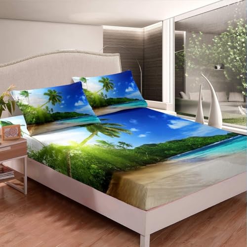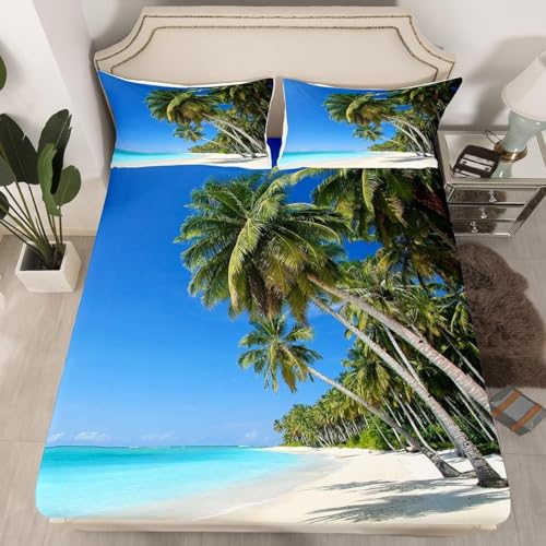 TACOKI Drap Housse 140x190 Plage, 3D Palmier Drap-Housse 140 x 190, Drap Plat 2 Personnes, Drap Housse Enfant Adulte avec 2 Taies d'oreillers pour Matelas Épais a5855