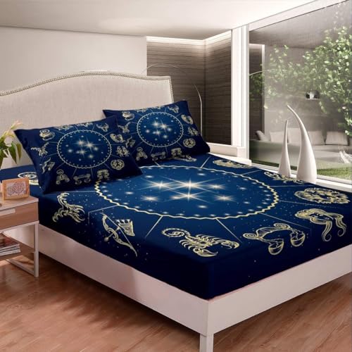 Drap Housse 140x190 cm Zodiaque, 3D Constellation Drap-Housse en Microfibre, Drap Plat 2 Personnes, Drap Housse avec 2 Taie d'oreillers pour Matelas Épais CL3811