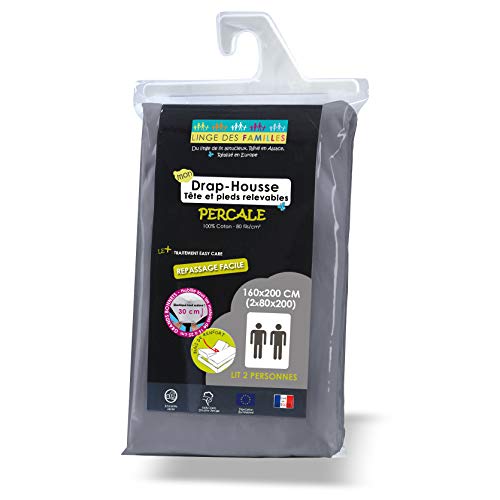 Linge des Familles - Drap Housse 2x80x200 - pour Lit Articulé 160x200 TPR - 100% Coton Percale - Gris Foncé - Grand Bonnet 30 cm - Elastique Tout Autour - Oeko-TEX® Standard 100 - Made in Europe