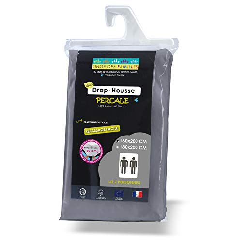 Linge des Familles - Drap Housse 160x200 cm - 100% Coton Percale - Gris Foncé - Grand Bonnet 30 cm - Elastique Tout Autour - Label Oeko-TEX® Standard 100 - Made in Europe