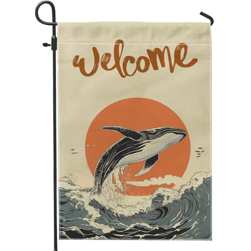 Drapeaux de jardin japonais en forme de baleine de l'océan - 30,5 x 45,7 cm - Double face pour l'extérieur - Vintage Asie marine standard - Drapeaux de pelouse en toile de jute - Pour arrière-cour
