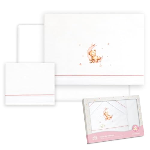 FILET - Set de Draps pour Landau Blanc et Rose, Composé de 1 Drap Inférieur avec Angles, 1 Drap supérieur avec Bandeau en Toile Aida à broder et 1 Housse, 100% Coton, Made in Italy
