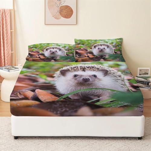 Drap Housse 140x200 Hérisson, 3D Drap-Housse Hérisson Drap Poche Profonde 30 cm, Draps Housse Microfibre, 2 Taies d'oreillers, pour Matelas éPais G5121