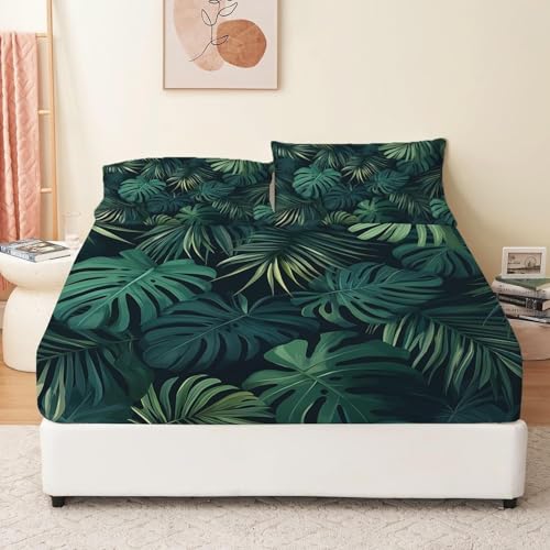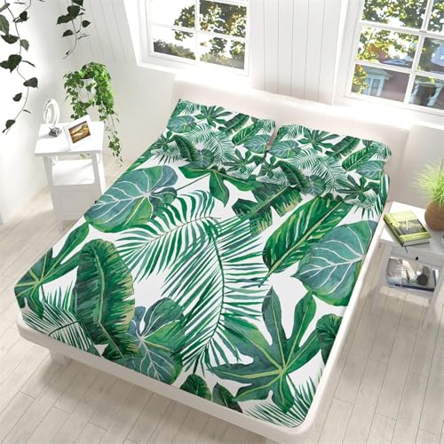 Drap Housse 160x200 Feuilles de Palmiers Tropicaux, 3D Drap-Housse Feuilles de Palmiers Tropicaux Drap Poche Profonde 30 cm, Draps Housse Microfibre, 2 Taies d'oreillers, pour Matelas éPais ii4586