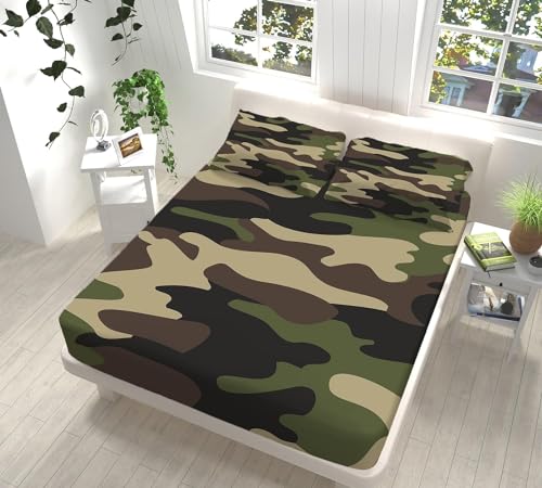 Drap Housse 90x190 Camouflage, 3D Drap-Housse Camouflage Drap Poche Profonde 30 cm, Draps Housse Microfibre, 2 Taies d'oreillers, pour Matelas éPais u3277