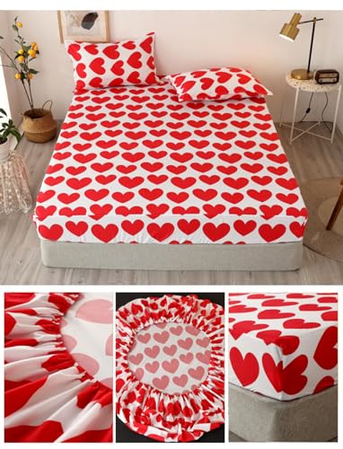 Drap Housse 180x200 Coeur d'amour Blanc Drap-Housse Coeur Rouge Drap Plat pour Lit avec Grand Bonnet de 30 cm Draps Housse Microfibre et 2 Taies d'oreillers, pour Matelas éPais