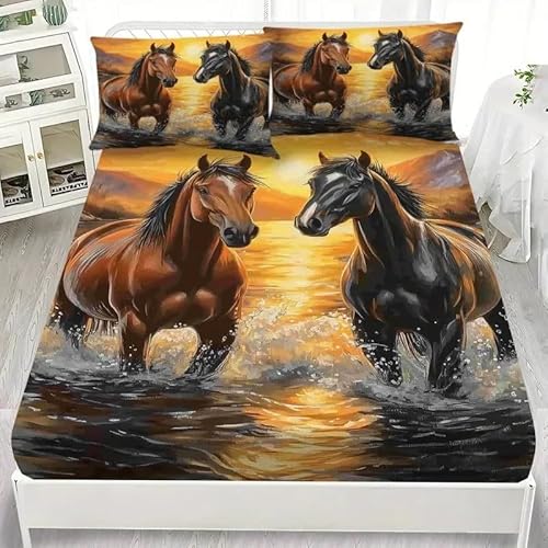Drap Housse 90x190 Coucher De Soleil Drap-Housse Cheval Draps Housse Microfibre avec Grand Bonnet de 30 cm, et 2 Taies d'oreillers, Lot Draps Housse, pour Matelas éPais