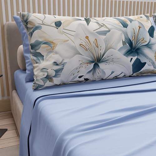 PETTI Artigiani Italiani - Parure de Draps en Coton pour Lit Double avec Taies d’Oreiller et Drap Housse 160x200, Motif Floral 30 Bleu Clair, 100% Fabriqué en Italie