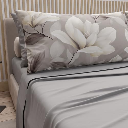 PETTI Artigiani Italiani - Parure de Draps en Coton pour Lit Double avec Taies d’Oreiller et Drap Housse 160x200, Motif Floral 34 Gris Clair, 100% Fabriqué en Italie