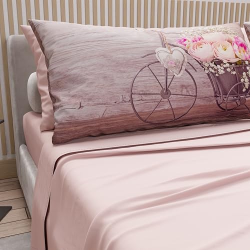 PETTI Artigiani Italiani - Parure de Draps en Coton pour Lit Double avec Taies d’Oreiller et Drap Housse 160x200, Motif Floral Rose Poudré, 100% Fabriqué en Italie