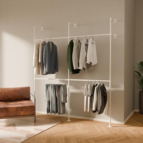 pamo Portant Vêtement Mural Industriel Blanc 296x222 cm – Penderie Murale Métal Style Tuyau – Dressing Ouvert Moderne – Charge 340 kg – Pour Chambre, Entrée ou Dressing