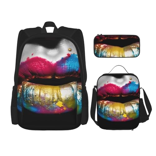 AABSTBFM Dark Hedges Ensemble de 3 sacs à dos d'école avec sac à déjeuner et trousse à crayons Motif Irlande du Nord, Colorful Woman Lip, Taille unique, Sacs à dos de jour